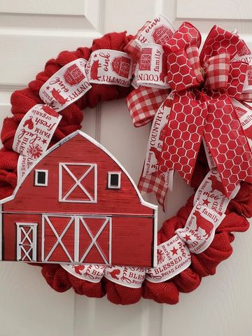 Red Burlap Wreath adorned with Red Farmhouse Ribbon and Barn 20x20